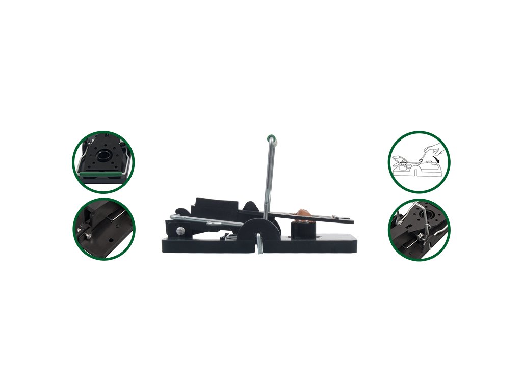 Zatlačením upínacího držáku se z pasti odstraní i myši zachycené bez kontaktu a hygienicky. Vzhledem k tomu, že past je vyrobena z odolných plastů, je snadné ji čistit a znovu používat.