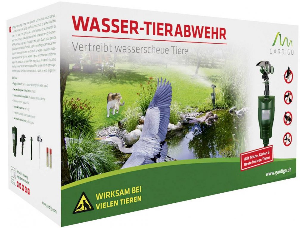 Vodní odpuzovač zvířat GARDIGO je účinný proti všem živočichům, kteří se bojí proudu vody a které byste rádi vyhnali ze své zahrady, pole či rybníka. Patří mezi ně třeba volavky, draví ptáci, kočky, psi nebo zajíci a jiná divoce žijící zvířata.