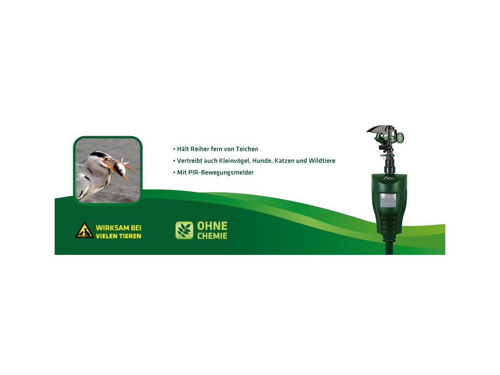 Objeví-li se v dosahu PIR čidla pohyb nevítaný zvířecí návštěvník, aktivuje se vodní proud s dosahem až 10 m. Zvířata, která nemají vodu v lásce, se jej polekají a utečou, a ve většině případů se danému místu budou i poté vyhýbat. Zařízení se skvěle hodí zvláště k šetrnému odhánění volavek z rybníků. Ptáci se u vody objevují zejména na jaře, když hledají potravu pro mladé. Toto ekologické zařízení lze díky užitého integrovanému solárnímu panelu provozovat na jakémkoli místě - vyžaduje pouze přívod vody. Lze jej tak podle potřeby umístit kamkoli, protože vodu mu můžete dodat připojením k běžné zahradní hadici.