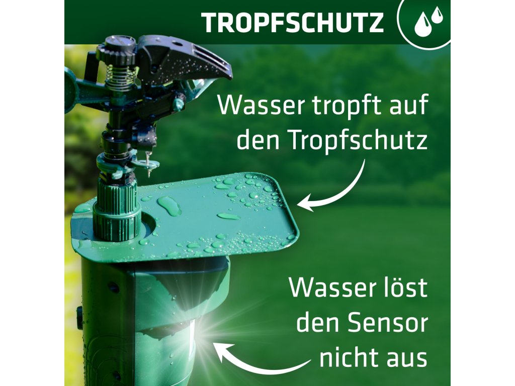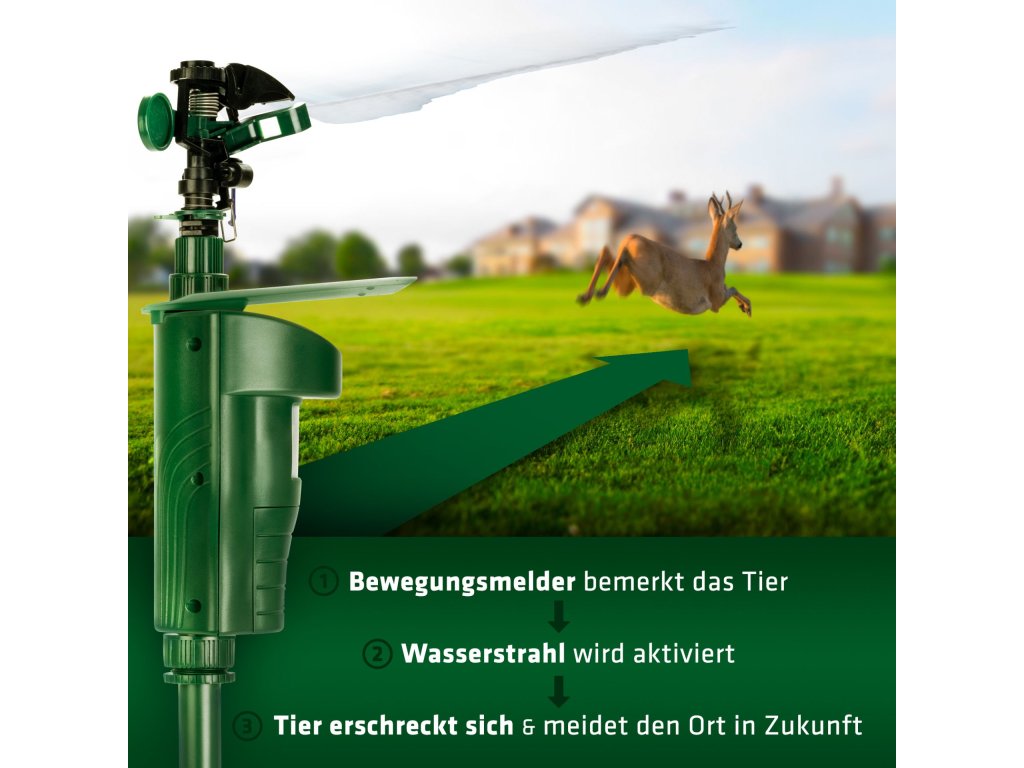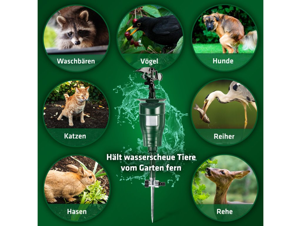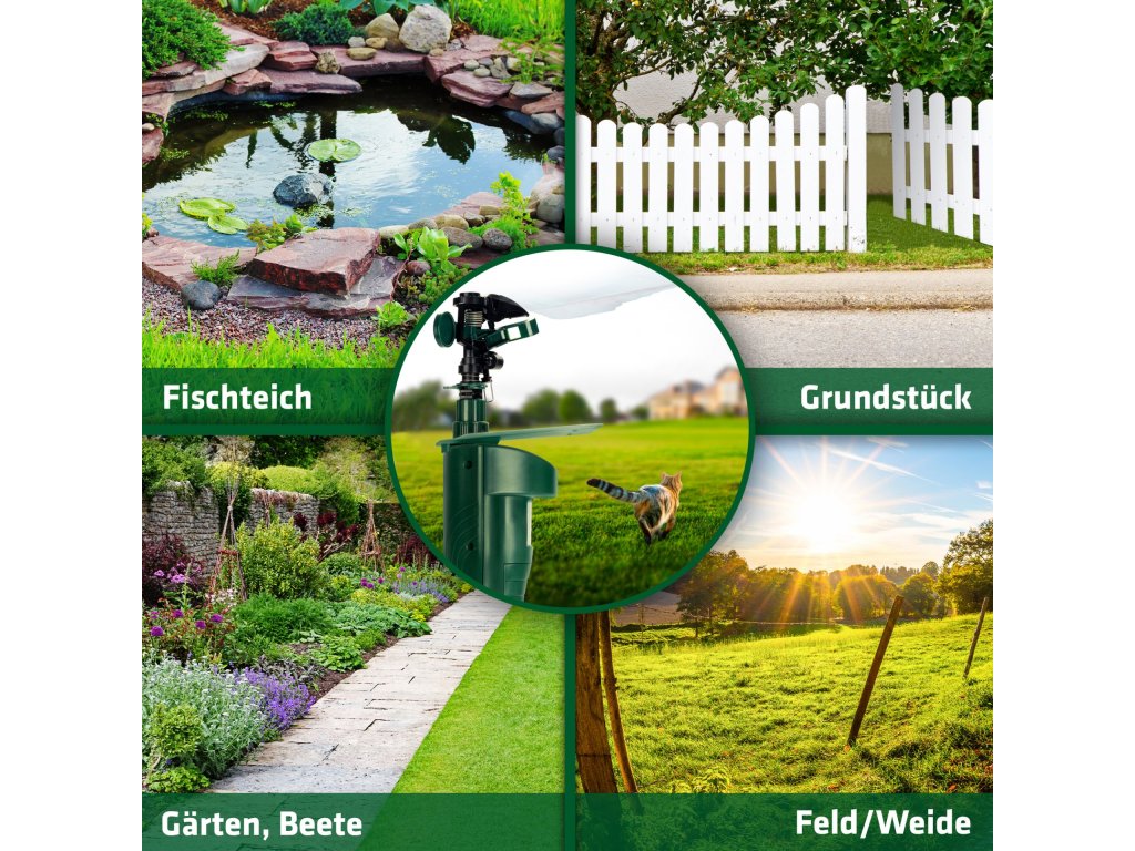 Objeví-li se v dosahu PIR čidla pohyb nevítaný zvířecí návštěvník, aktivuje se vodní proud s dosahem až 10 m. Zvířata, která nemají vodu v lásce, se jej polekají a utečou, a ve většině případů se danému místu budou i poté vyhýbat. Zařízení se skvěle hodí zvláště k šetrnému odhánění volavek z rybníků. Ptáci se u vody objevují zejména na jaře, když hledají potravu pro mladé. Toto ekologické zařízení lze díky užitého integrovanému solárnímu panelu provozovat na jakémkoli místě - vyžaduje pouze přívod vody. Lze jej tak podle potřeby umístit kamkoli, protože vodu mu můžete dodat připojením k běžné zahradní hadici.
