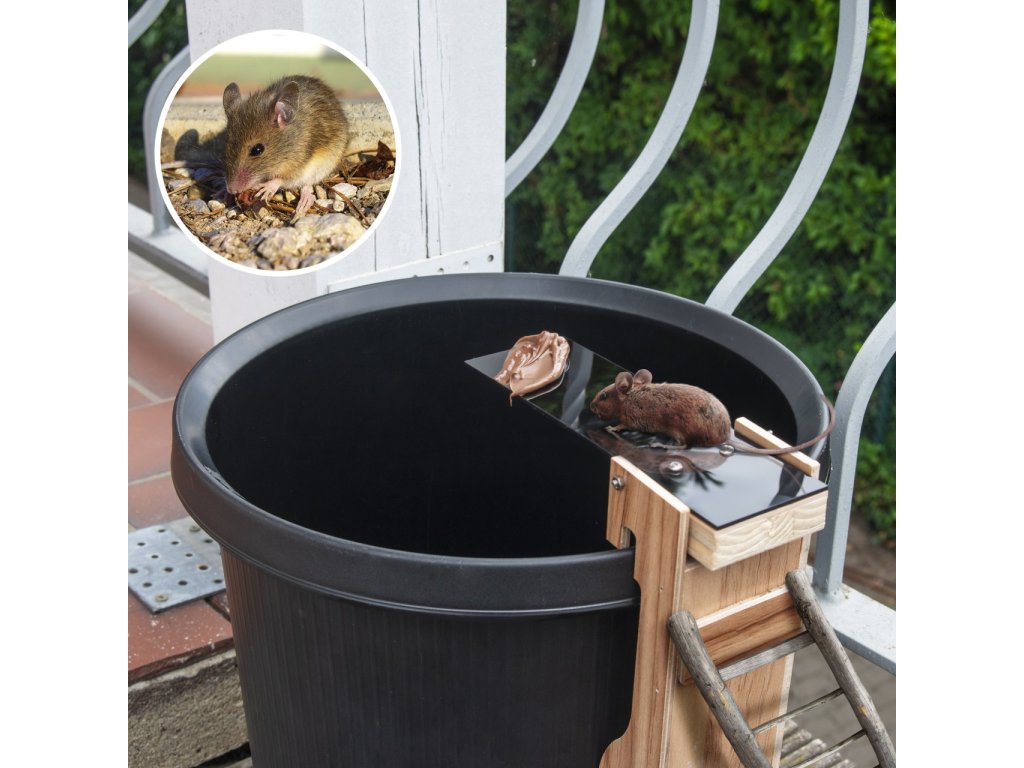 Pokud máte problém s velkým množstvím myší nebo potkanů, například na půdě, ve sklepě nebo v kůlně, pak jsou pasti nepraktické, protože se chytají pouze jednotlivá zvířata. šplhací žebřík nebo prkénko nebo podobnou věc, tak aby myš vylezla na okraj kbelíku. Pokud se hlodavec pokusí dostat k návnadě, tyčka s ložiskem se otočí a hlodavec spadne do kbelíku a myš je chycena. Kbelík doporučujeme vycpat slámou, aby se zvířata při pádu nezranila. Neplňte kbelík vodou. Past je navržena na sklouznutí myší jako živá past. Past kontrolujte několikrát denně, abyste předešli zbytečnému stresu zvířat.