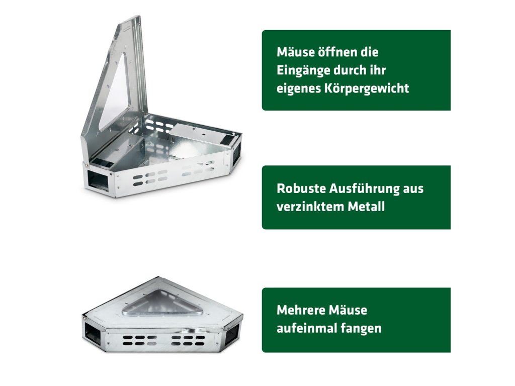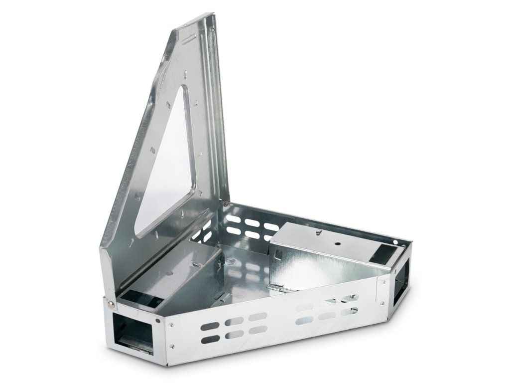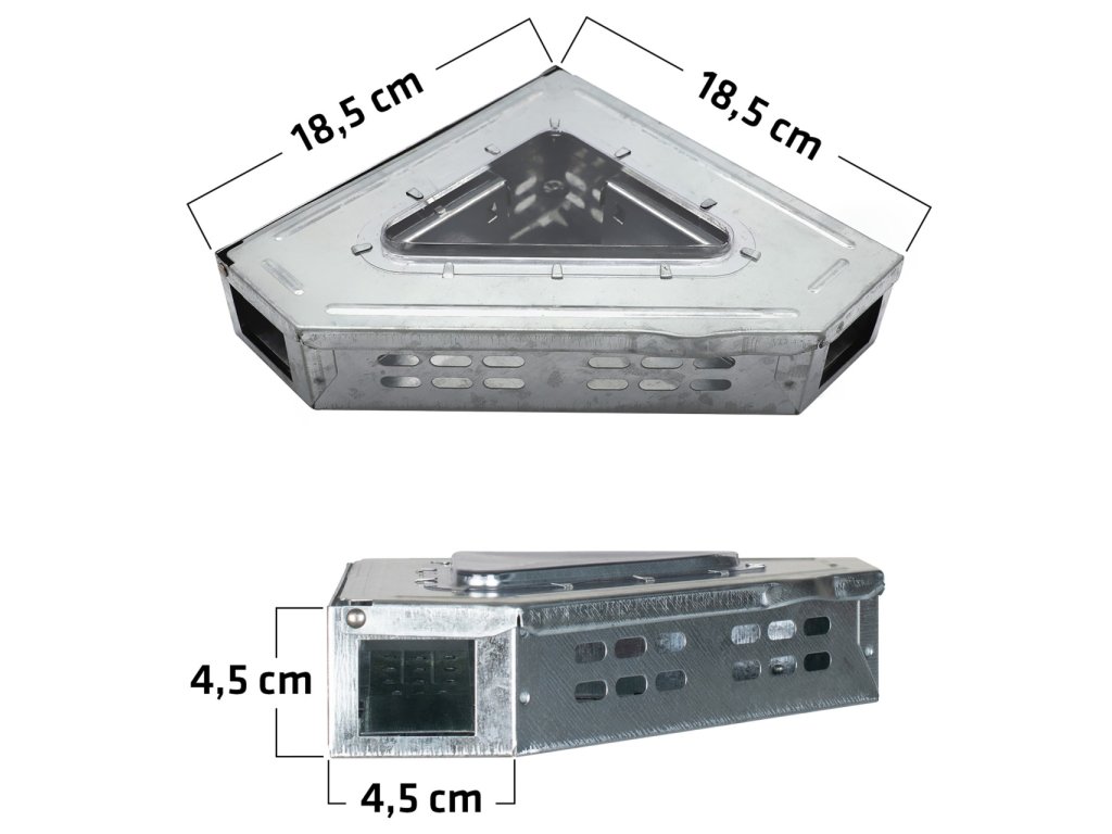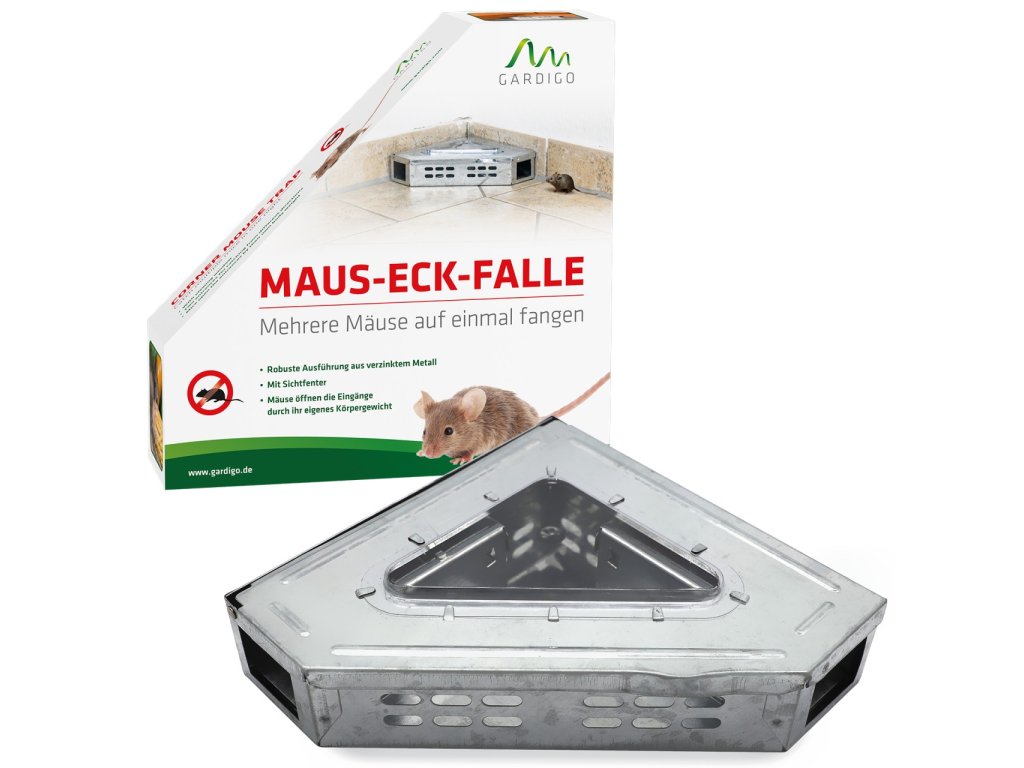 Rohová past na myši od Gardigo je živá past na myši vyrobená s pozinkovaného plechu. Použití je velmi jednoduché: chceteli přidat návnadu, jako je sýr, slanina atd. stačí jednoduše otevřít vrchní víko. Past s návnadou umístěte do rohu místnosti. Protože se myši pohybují podél zdi v chráněných oblastech, je to dobré místo na nastražení pasti. Vzhledem k tomu, že rohová past na myši má vchod či východ na každé straně, lze myši chytat z obou směrů.